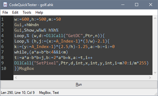 CodeQuickTester is a portable single-file script editor that allows you to write code, and then run it without having to save to a temporary file.