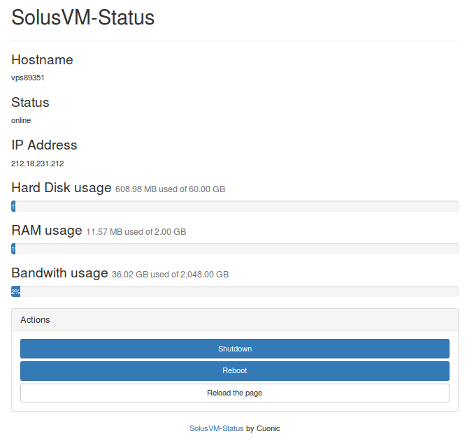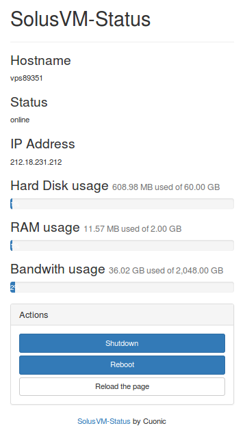 SolusVM-Status is a quick way to check up on your SolusVM VPS to see if it is online, check out the memory / disk space / bandwith usage and quickly shutdown, reboot or boot the VPS without entering the SolusVM control panel.
