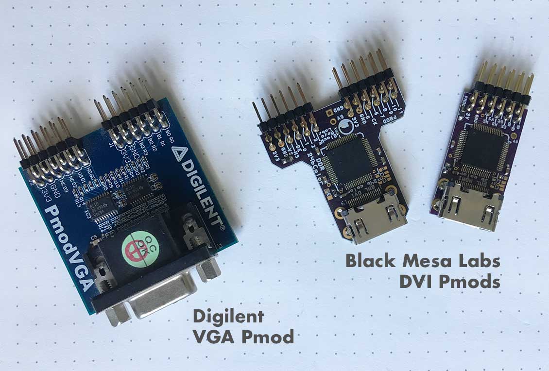 The Black Mesa Labs (BML) Pmod is based on the Texas Instruments TFP410. The Pmod is restricted to standard DVI features but allows even tiny FPGAs to support DVI signalling. As of February 2019, there is an unresolved issue when using a BML DVI Pmod with HDMI displays: some displays report a signal error and show nothing. This issue isn't confined to Project F but has also been reported by Black Mesa Labs themselves.